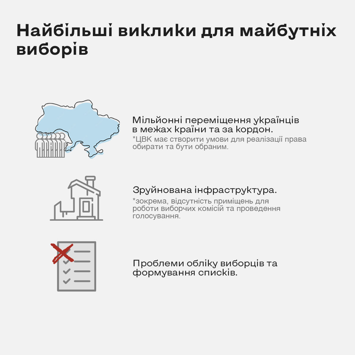Через повномасштабну війну, тимчасову окупацію територій, масштабні переміщення українців, традиційно низькі показники реєстрації громадян за фактичним місцем проживання – якісний облік виборців та створення умов для формування точних списків виборців стали величезним викликом. Особливо гострою виявиться проблема оновлення відомостей про виборців, чиї виборчі адреси належать до територій, що були під тимчасовою окупацією ще з 2014 року.