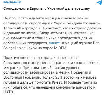 На основі маніпулятивного цитування соціологічних досліджень Telegram-канали вдаються до не менш маніпулятивних висновків і прогнозів, пророкуючи припинення підтримки України та її громадян країнами Заходу вже найближчим часом.