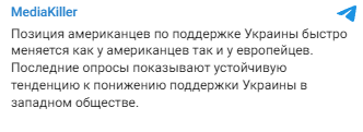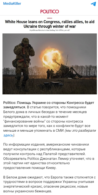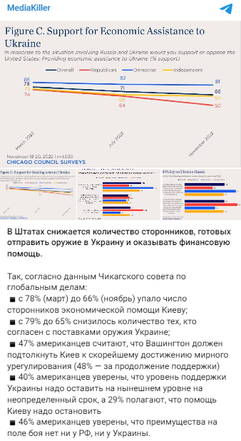 Майже ідентичні публікації про "стрімке падіння" в американців рівня підтримки України наприкінці грудня розмістили в себе "Резидент", "Наблюдатель", "MediaKiller", "Одесский фраер", "First Новости войны" та інші Telegram-канали. Деякі з них навіть зробили це двічі.