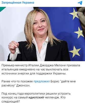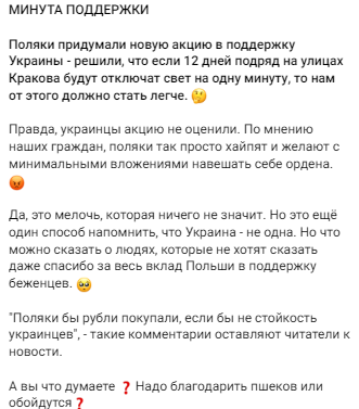 Регулярними є спроби перенаправити невдоволення українців через відключення світла, з росіян, які обстрілюють критичну інфраструктуру, на… громадян західних країн. Мовляв, ті недостатньо допомагають і взагалі насолоджуються життям, поки Україна потерпає від війни. З цією метою в Telegram-каналах знецінюються акції солідарності.