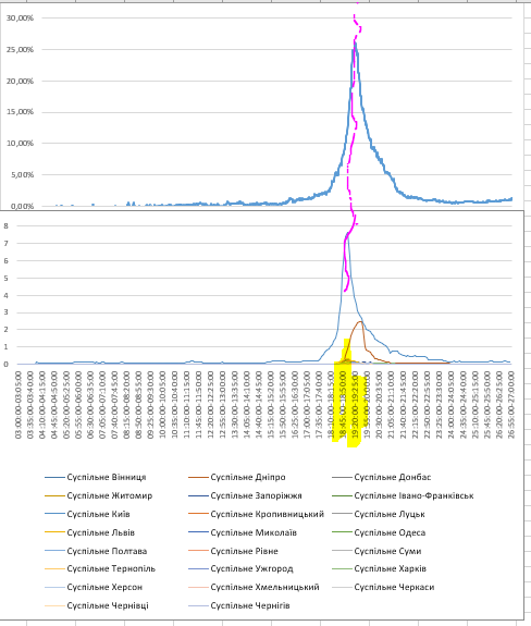 Перед початком матчу і станом на початок матчу глядачів каналу "Суспільне Регіони" (це один канал, який транслюється під багатьма різними логотипами) зібралося в 250-300 разів більше, ніж дивиться цей канал зазвичай.