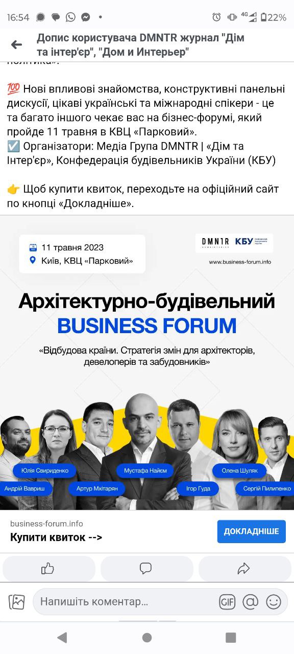 Хоча є події за участю топполітиків і чиновників, які чудово анонсуються. Так, 11 травня відбудеться бізнес-форум, квиток на який коштує 8000 гривень. Ми зафіксували близько 30 рекламних оголошень у Facebook, зокрема з боку Конфедерації будівельників України. Тобто це те, що вигідно забудовникам.