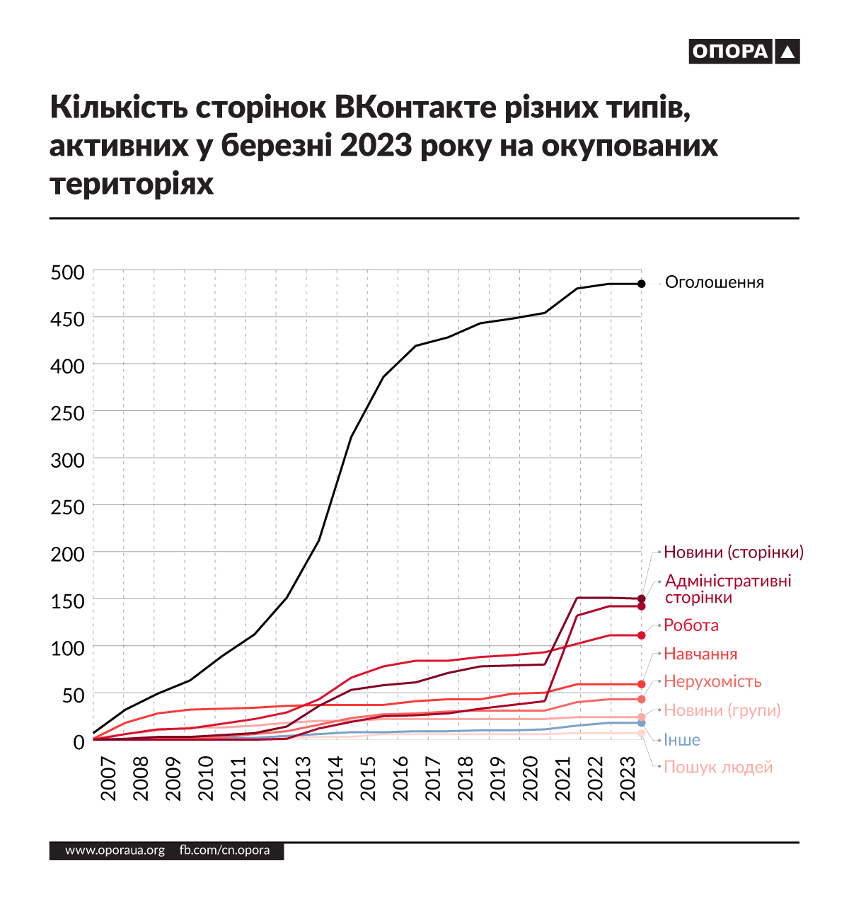 До того ж, якщо кількість сторінок про навчання та нерухомість майже не змінилася з початком повномасштабного вторгнення, то адміністративні й новинні сторінок з’являлися у 2022–2023 роках. Натомість найбільша категорія – оголошення – активно розширювалася з 2014 року, але після початку великої війни майже не зростала.