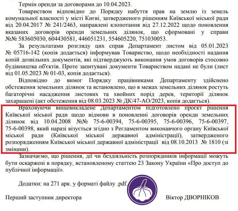 "Профільний департамент відправив запит на це товариство, щоб отримати відповідні документи, але воно їх так і не надало. Цю частину лісу обстежили інспектори і виявили, що там ростуть багаторічні дерева. Департамент пропонує Київраді проєкт рішення щодо відмови в подовженні оренди", – наголошує заступник голови КМДА Петро Оленич.