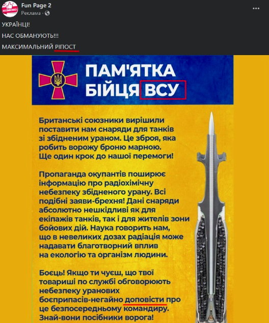 Раніше 28 березня Центр стратегічних комунікацій зафіксував, що тему радіоактивних снарядів почали просувати на українську аудиторію. Фейкову "Пам’ятку бійця ВСУ" (саме так, замість "ЗСУ") зі згадкою про "благотворний вплив радіації на здоров’я людини" росіяни поставили на рекламу через Facebook для української аудиторії, щоб підігрівати чутки про радіаційний витік.