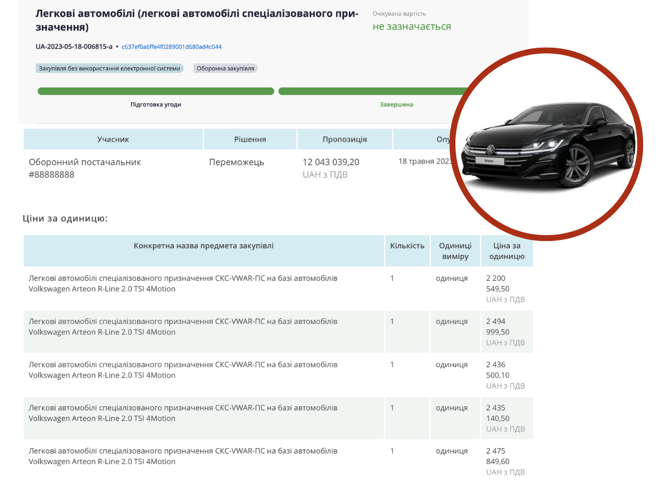 П'ять автомобілів спецпризначення СКС-VWAR-ПС на базі Volkswagen Arteon купили без тендерів для потреб Нацполу за 12 млн грн в невідомого постачальника. Загалом у травні Національна поліція придбала автомобілів на близько 100 млн грн – 35 легкових, 10 автобусів та бусів, а також 9 вантажних. Натомість авто з публічними закупівлями купують ГУНП в регіонах. Майже у кожній області поліція купувала автівки, однак скромніші – Renault Duster, Opel Grandland та ін.