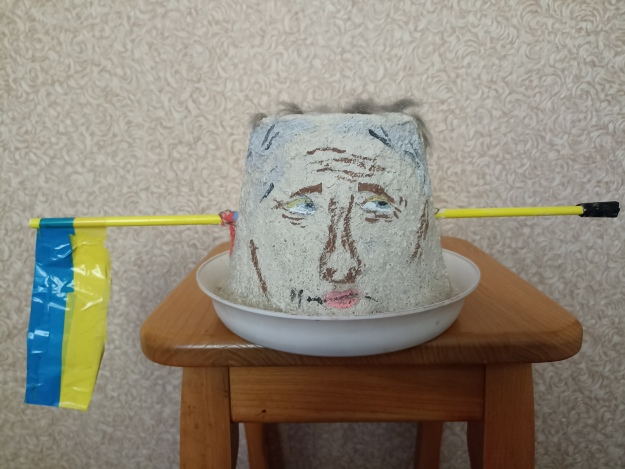 Інсталяція, яку Надя зробила мамі на день народження. Олена відповіла, що б хотіла в подарунок: "Голову Путіна". Матеріал – солоне тісто, гуаш, вичесана котяча шерсть. Прапор України – пластмасова паличка – вставлений у вуха. Обличчя Путіна здивоване. Путін дуже схожий.