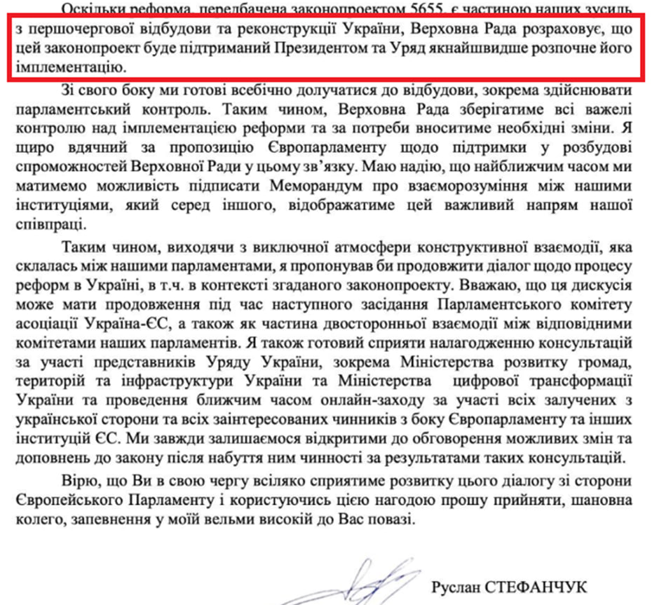 Рух ЧЕСНО та низка інших громадських організацій, зокрема "Автомайдан", De JURE, Центр спільних дій, Інститут законодавчих ініціатив, теж направили звернення до Європарламенту. Важливо, що його підписала і редакція "Дзеркала тижня", і асоціації, які представляють архітекторів та органи місцевого самоврядування. Тобто одразу кілька секторів вбачають у цьому законопроєкті загрозу для чесної відбудови і неприйнятність таких комунікацій з боку політичного менеджменту країни.