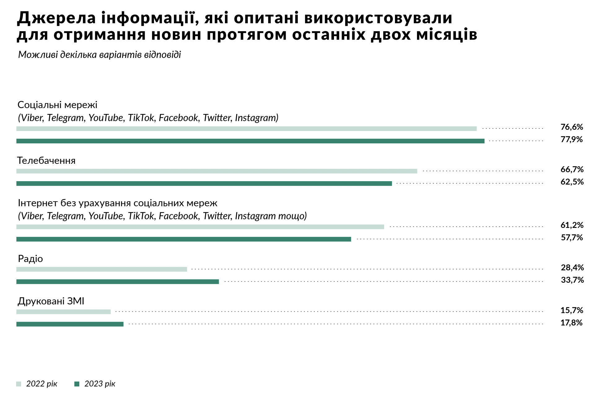 Загалом у 2023 році телебачення та соціальні мережі майже зрівнялися за рівнем довіри. З незначним відривом лідерство зберігає телебачення (61,1%), а соціальним мережам довіряють рівно 60% опитаних. Довіра до інтернету без соціальних мереж дещо знизилася порівняно з минулим роком та у 2023 році сягнула 45,1%. Трохи менше українців висловили довіру радіо (41%) та друкованим ЗМІ (30,3%), хоча порівняно з минулим роком рівень довіри до цих медіа зріс. Не довіряють жодному з джерел майже 8% респондентів.