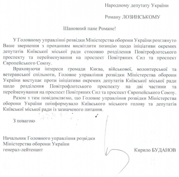 Начальник ГУР МО Кирило Буданов надав відповідь на моє депутатське звернення і повідомив, що, враховуючи інтереси громади Києва, військової, волонтерської та ветеранської спільноти, Головне управління розвідки Міноборони виступає проти ідеї окремих депутатів поділу проспекту на два.