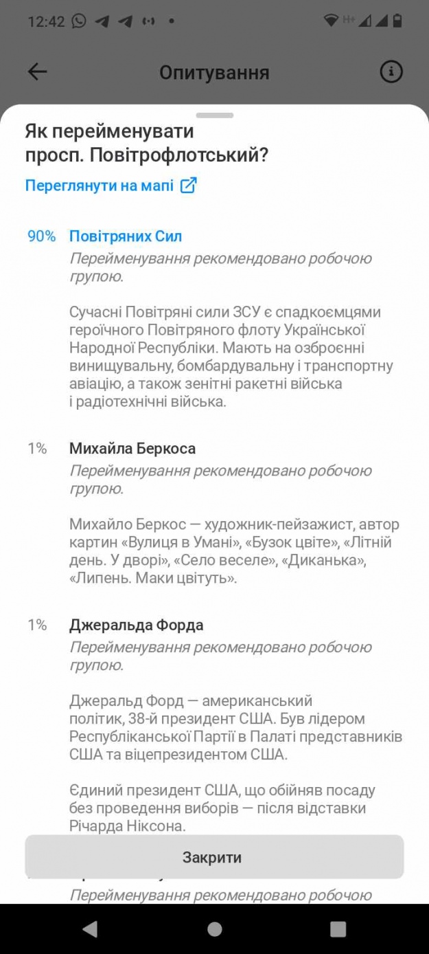 На початку грудня 2023 року в застосунку "Київ Цифровий" завершилося опитування киян стосовно перейменування топонімів у столиці. Тоді за перейменування Повітрофлотського на проспект Повітряних Сил проголосували 90% опитаних з 38 тисяч учасників обговорення. Наскільки мені відомо, це рекордний показник підтримки для рейтингових електронних голосувань у Києві. Підтримка ж варіанту проспект Європейського Союзу складала лише 5%. Експертна топонімічна комісія Києва, яку очолює відомий український історик та військовослужбовець Олександр Алфьоров одностайно підтримала проспект Повітряних Сил.