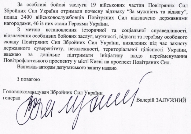 З огляду на те, що це перейменування стосується інтересів військових, я звернувся до Головнокомандувача ЗСУ Валерія Залужного, Командувача Повітряних Сил ЗСУ Миколи Олещука та Начальника ГУР Кирила Буданова із проханням висловитися з цього питання. Усі генерали підтримали ініціативу перейменувати Повітрофлотський саме на проспект Повітряних Сил. В якості вдячності мужнім воїнам, які щодня і щоночі бережуть повітряний простір над Україною.