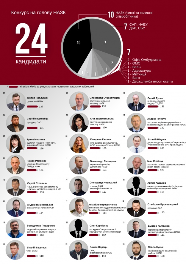 За крісло голови НАЗК змагаються 3 жінки і 21 чоловік. 10 кандидатів – чинні та колишні співробітники НАЗК. Крім того, є працівники правоохоронних органів (САП, НАБУ, ДБР, СБУ), Офісу Омбудсмана, Держслужби якості освіти, ОМС, член ВККС, адвокат, голова ДІАМ, колишній працівник митної служби.