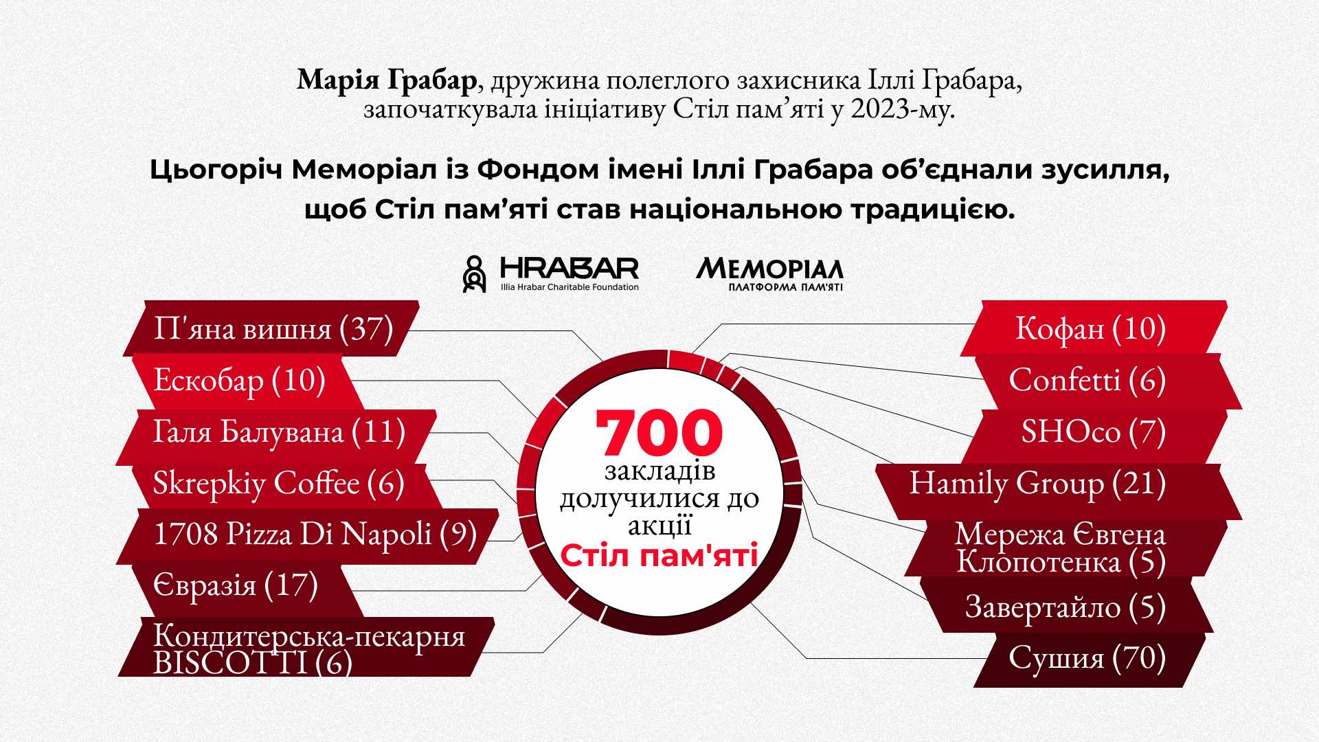 Ми щиро вдячні рестораторам, які відгукнулися і стають співтворцями нової культури пам’яті в Україні. Це більше 700 закладів, не тільки в Україні, а і в Польщі, Великобританії, Чехії, Португалії, Швеції.
