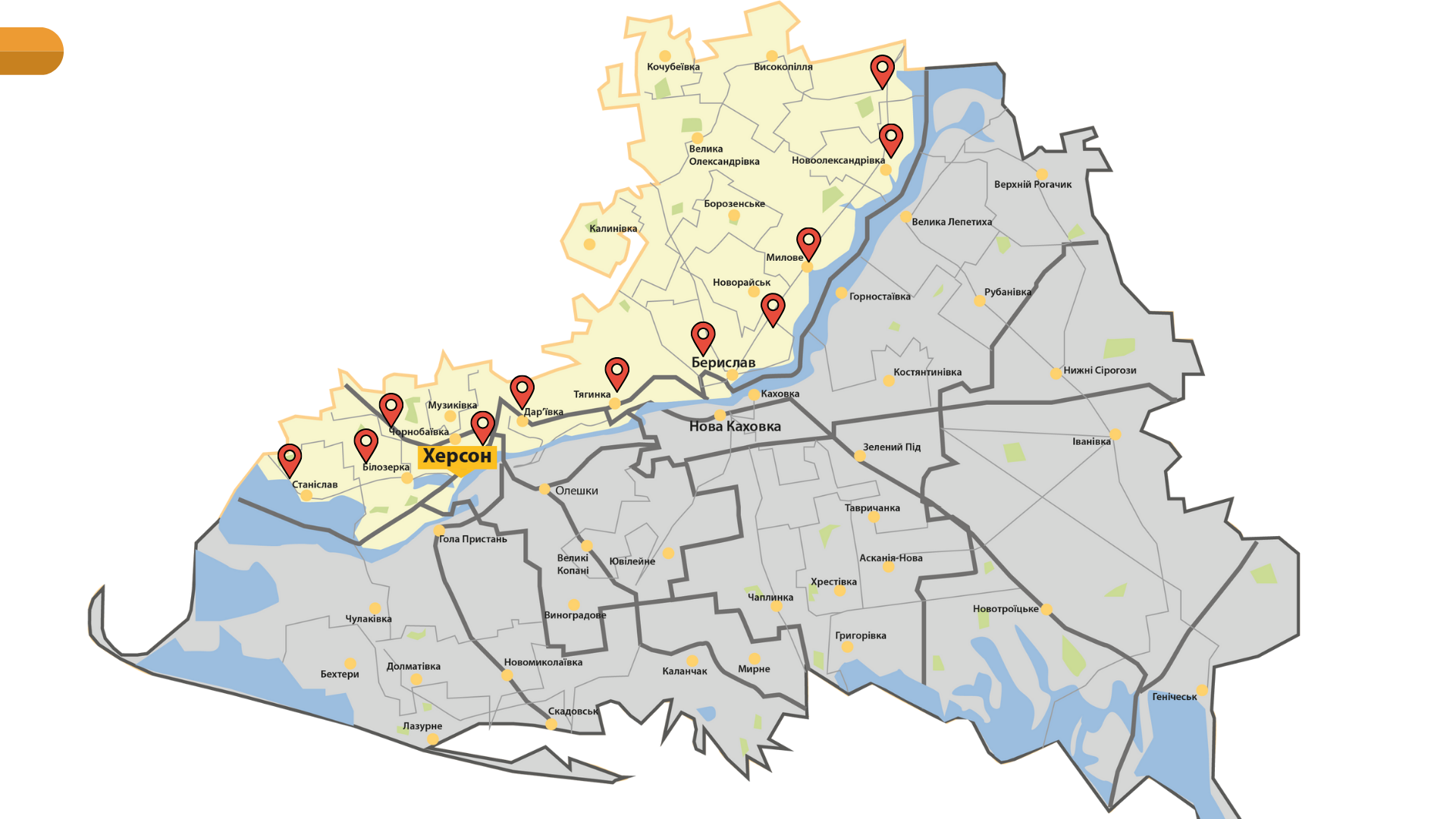 Низка громад й надалі перебуває у "червоній зоні": Херсонська, Білозерська, Станіславська, Чорнобаївська, Дар'ївська, Тягинська, Бериславська, Новорайська, Милівська, Новоолександрівська, Нововоронцовська. У цих громадах проживає 141,193 особи.