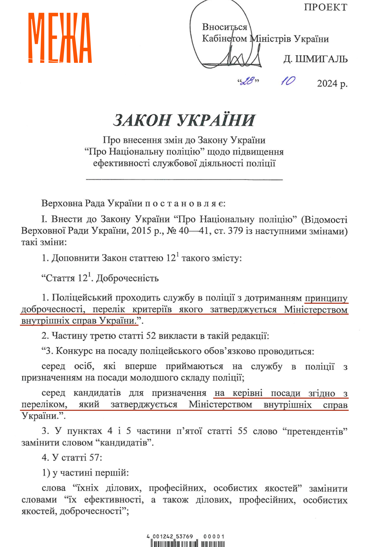 Законопроєктом передбачається, що "поліцейський проходить службу в поліції з дотриманням принципу доброчесності, перелік критеріїв якого затверджується Міністерством внутрішніх справ України". Визначати критерії буде знову МВС.