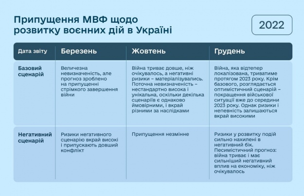 МВФ також в макропрогнозі на 2024 рік закладав сповільнення бойових дій вже у середині 2024 року. Це припущення вони змінили лише при п’ятому перегляді Програми, який відбувся місяць тому. Навіть у песимістичному сценарії вказали дату завершення активної фази війни – до кінця 2025 р.
