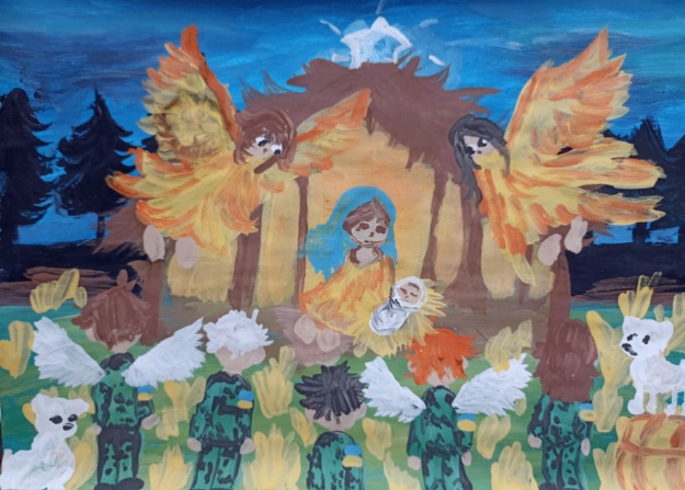 "До свята Різдва Христового ГО "ВПО України" Полтавщини оголошує конкурс дитячого малюнка "Подаруй Різдвяну казку військовим"". Надя намалювала вертеп. Замість волхвів – військових. Волхвів п’ять. Два – з білими крилами, троє – без. Два білі пси з ними, не схожі на Патрона. Змучена Мадонна в жовтій сукні та синій накидці. Немовля – Ісус – спить.