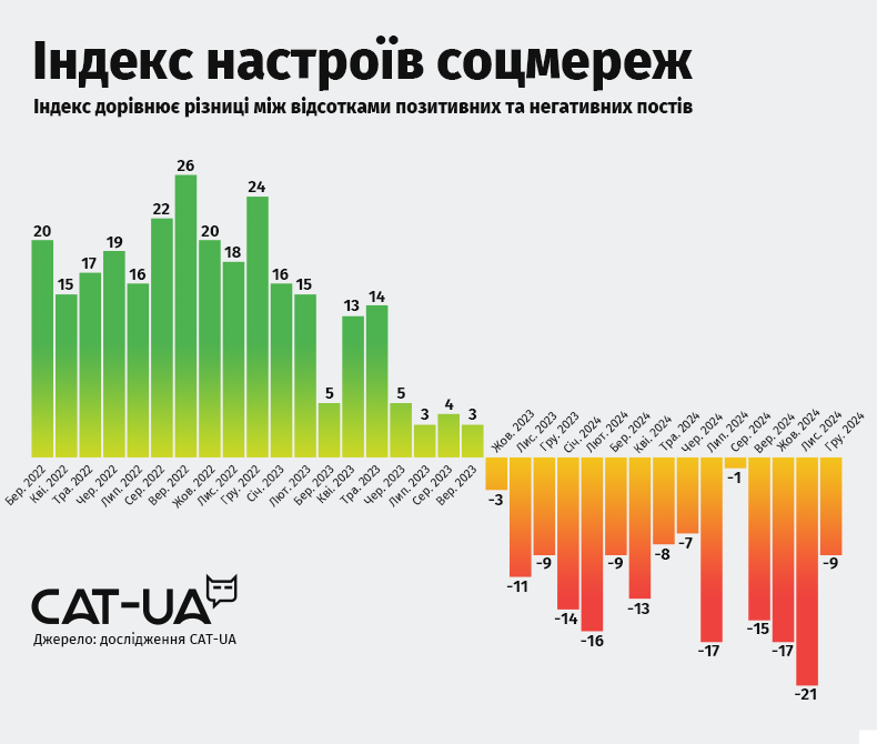 Перший день 2025-го року був майже втричі песимістичнішим за перший день 2024: мінус 20 пунктів за нашим індексом настроїв соцмереж щодо війни проти мінус 7 торік. Нагадаємо, що цей індекс ми рахуємо як різницю частки хороших і поганих новин в українському інфопросторі щодо війни.