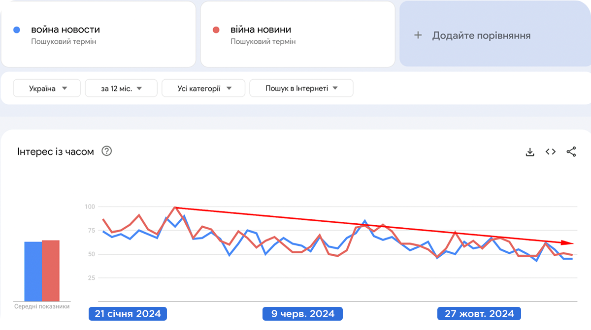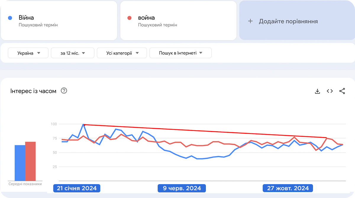 Що означає зменшення запитів? На мою думку, це точно не показник того, що війна турбує українців менше, ніж рік тому. Скоріше, навпаки – вона остаточно стала буденною частиною нашого життя.