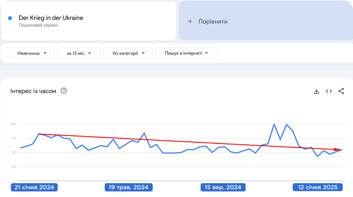 Тренд на зниження також присутній з 2023 року, але за останні 15 місяців інтерес залишається досить стабільним. Можемо зробити висновок, що німецьке суспільство і далі цікавиться ситуацією в Україні, тема війни актуальна. Про це, до речі, додатково свідчать передвиборчі заяви кандидатів на дострокові вибори в Бундестаг, які мають відбутися в лютому.