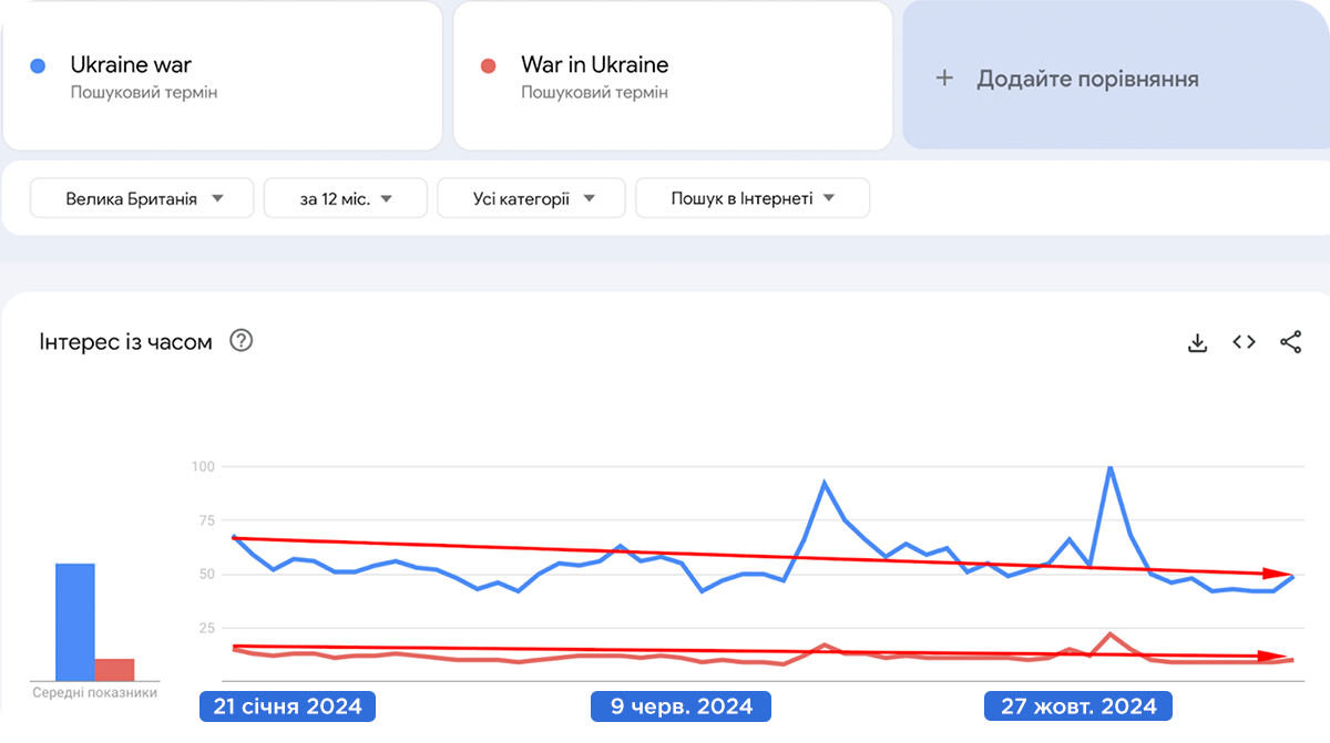 Якщо переглянути тренди за три останні роки, то бачимо картину, подібну до вищезгаданих: інтерес падає, але в Британії все-таки найменше, з піковими зростаннями в другому півріччі 2024 року.