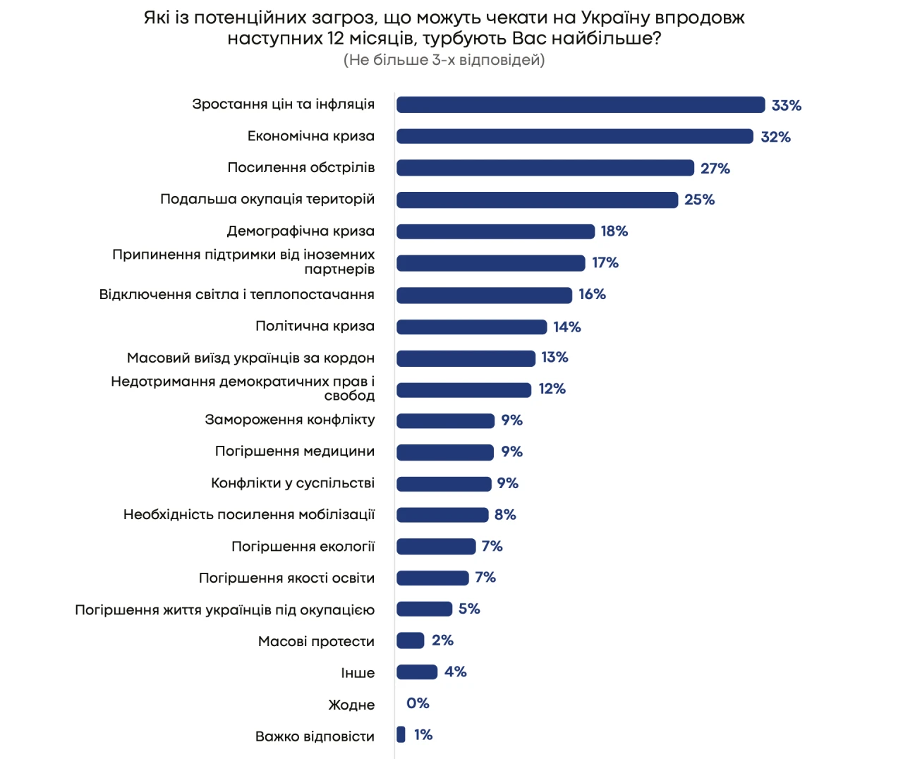 В представлених результатах опитування особливо цікаво виглядає трійка лідируючих пунктів загроз: "Зростання цін та інфляція" – 33%, "Економічна криза" – 32%, "Посилення обстрілів" – 27%, а також пункт "Подальша окупація територій", який зайняв 4-те місце, набравши 25%.
