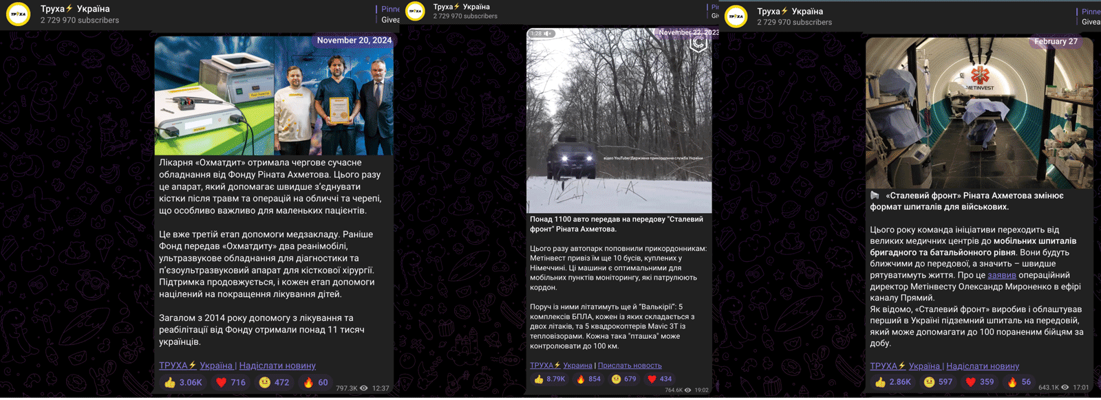Так само часто в Telegram можна натрапити й на дописи про Фонд Ріната Ахметова, де не згадують про політичну карʼєру його засновника. Зокрема, десятки дописів про цей фонд опублікував один із найпопулярніших загальноукраїнських Telegram-каналів "Труха⚡️Україна".