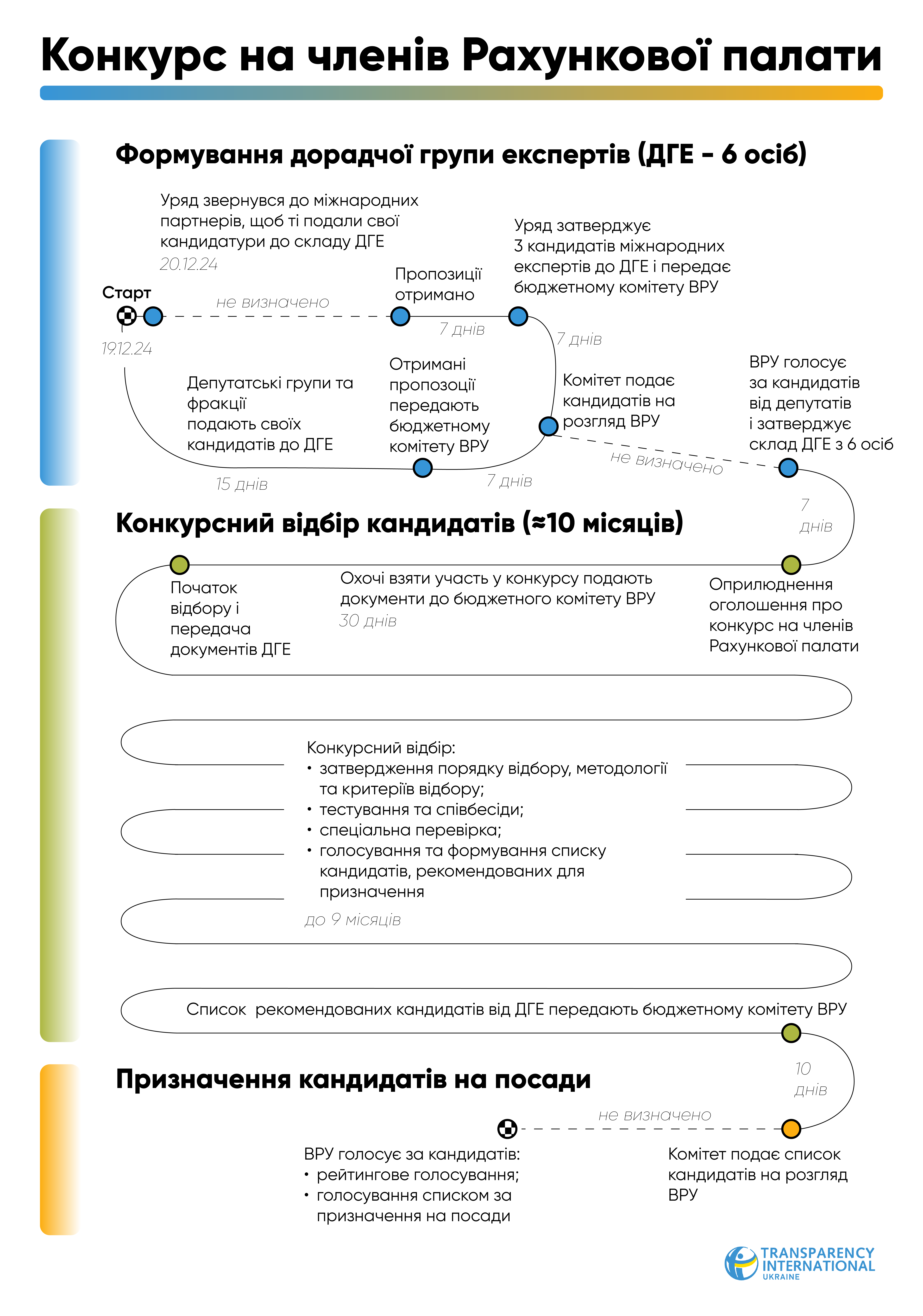 Охочі стати членом Рахункової палати матимуть 30 днів з дня оголошення конкурсу, щоб подати свої документи до бюджетного комітету Верховної Ради. Далі він передасть усі подані документи на розгляд дорадчій групі експертів. Водночас інформацію про кандидатів, які подалися, мають опублікувати на сайті ВРУ.