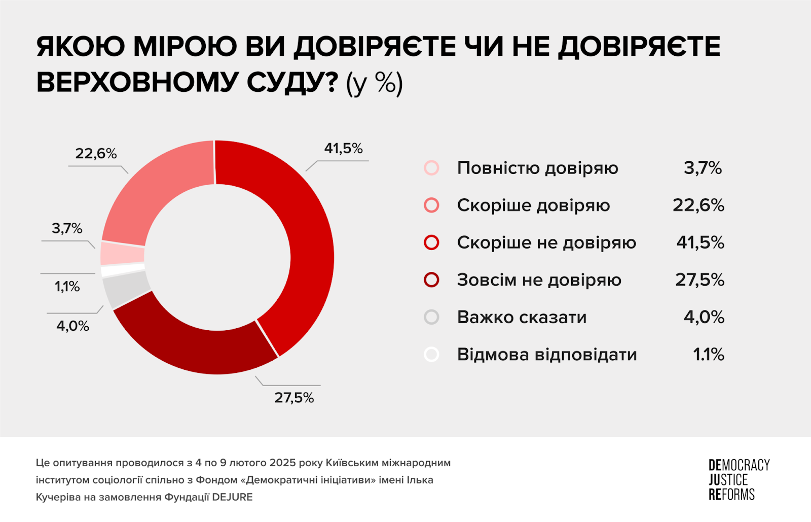 У 2025 році недовіра українців до Верховного Суду (ВС) сягнула 69% — про це свідчать результати соціологічного опитування, проведеного Фундацією DEJURE. Серед основних причин негативного ставлення до судової системи українці вказують: корупцію, залежність суддів від політиків та олігархів і недостатню доброчесність суддів. Ці результати вкотре підтверджують гостру необхідність реформування Верховного Суду та оновлення його кадрів.