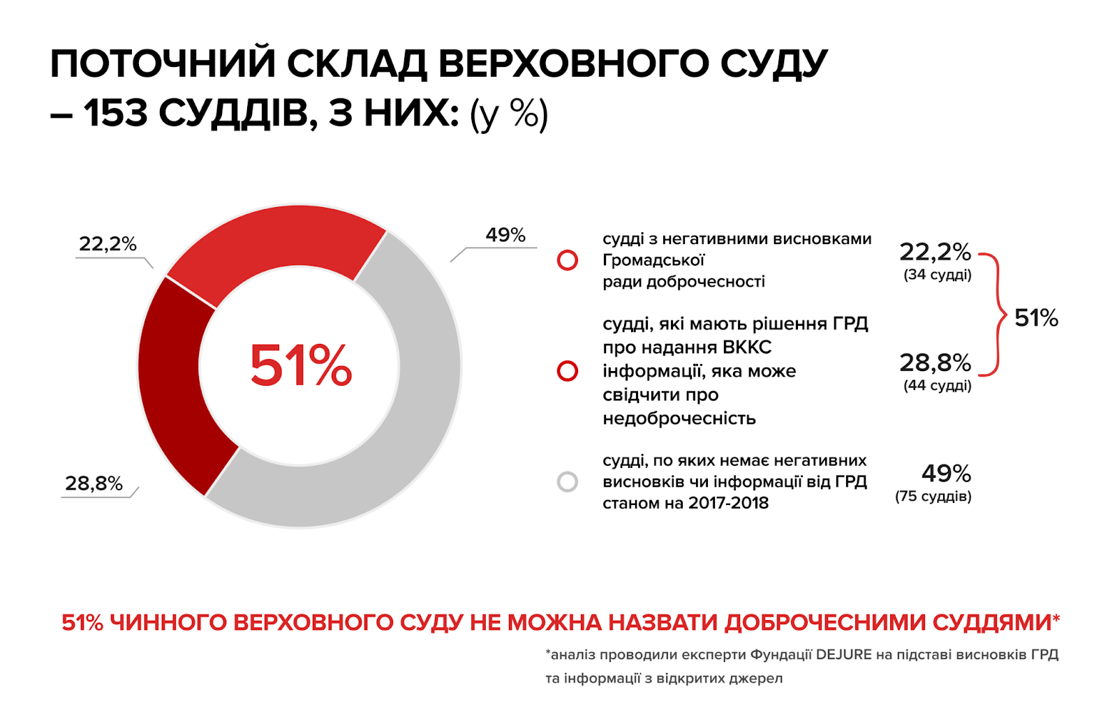 Тепер репутація та рівень довіри до суду продовжують з гучним тріском провалюватися. Більше 51% чинних суддів Верховного Суду можуть бути недоброчесними станом на 2025 рік. Про це свідчать негативні висновки та інформація від Громадської ради доброчесності. Експерти Фундації DEJURE проаналізували наявні дані щодо 153 чинних служителів Феміди з Верховного Суду. З них 34 — мають негативні висновки від ГРД, а щодо 44 є інформація, яка може свідчити про недоброчесність. Зокрема, це дані від журналістів про зв'язки кандидата з росіянами, певні питання до декларування чи судових рішень тощо.