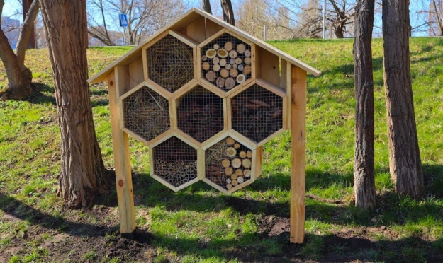 Ще одним реалізованим у Києві природоорієнтованим рішенням стали будиночки (або, як їх ще називають, – готелі) для комах. Це невеликі конструкції з дерева, соломи, шишок, бамбукових паличок та інших природних матеріалів, встановлені у міських зелених зонах. Як можна здогадатися з назви, будиночки покликані подарувати прихисток корисним комахам: бджолам, сонечкам, жужелецям та іншим.
