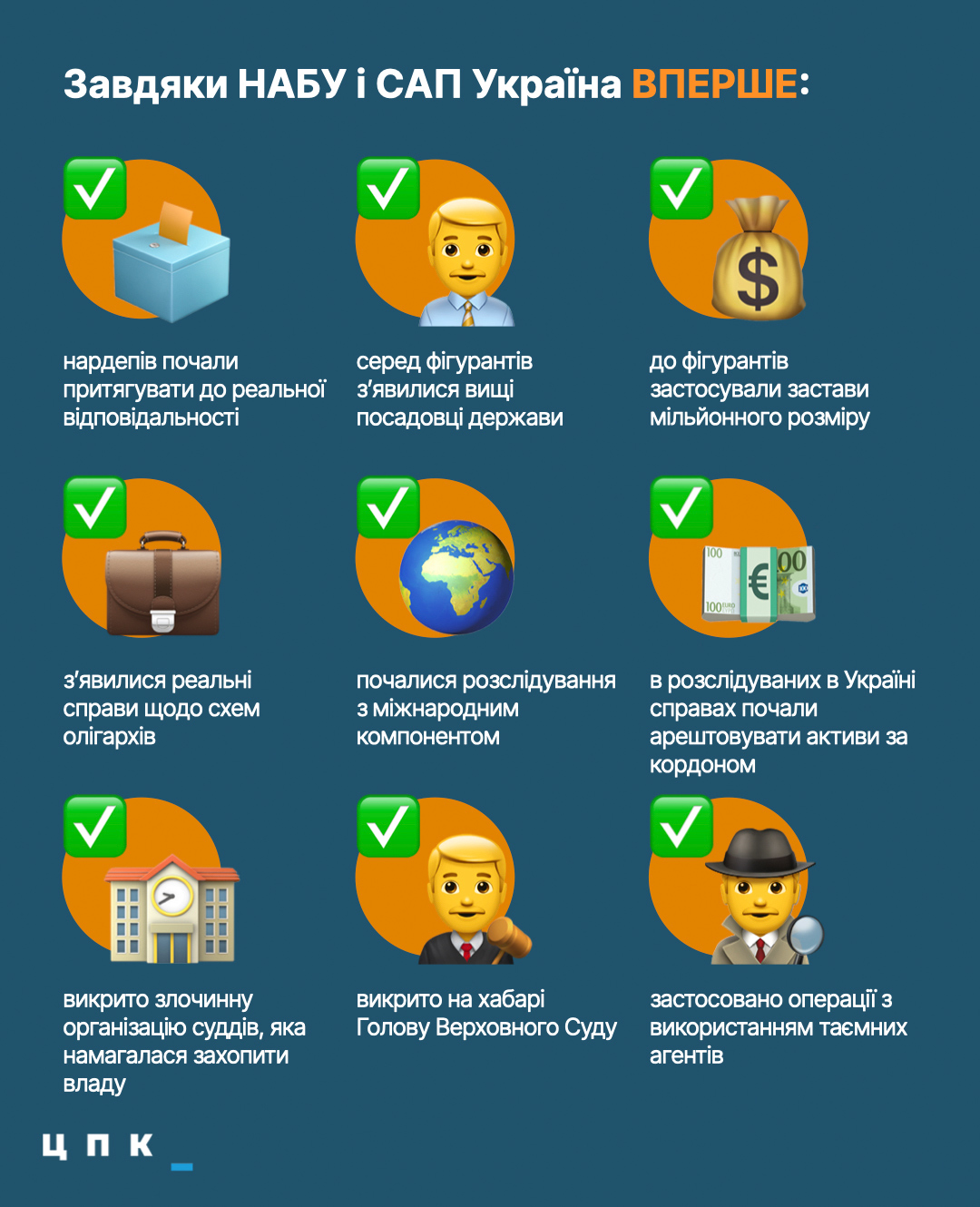 - вперше почалися серйозні розслідування з активним використанням міжнародного компонента. Обмін доказами з іноземними країнами, активні слідчі дії як то обшуки і доступ до документів і навіть спільні слідчі групи з іноземцями щодо розслідування корупції вперше активно почали застосовувати НАБУ і САП. За ці повноваження тривала окрема боротьба, яка ще не завершена, але саме це наводило чи не найбільше страху для владної верхівки, бо дозволяло одночасно проводити розслідування корупції в кількох юрисдикціях, що створювало фігурантам в рази більше проблем;