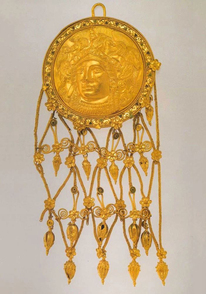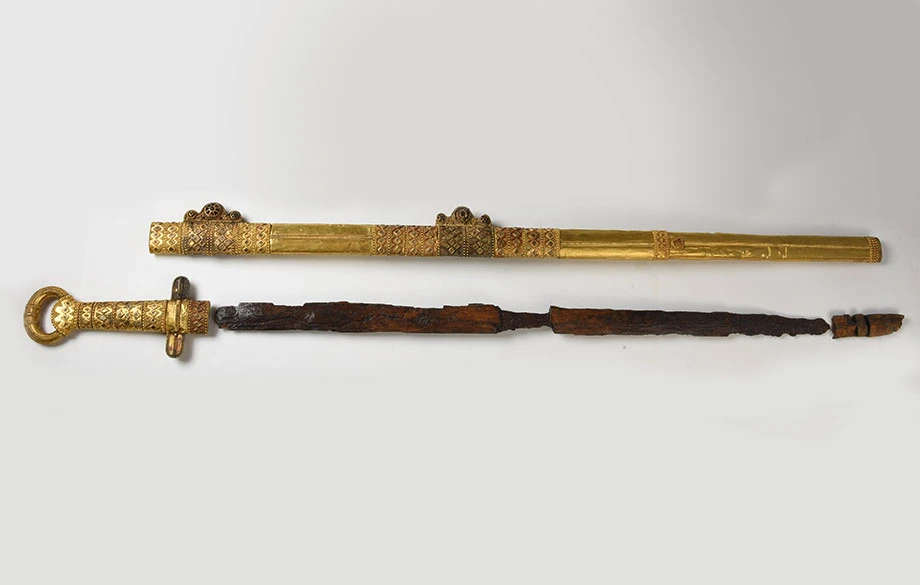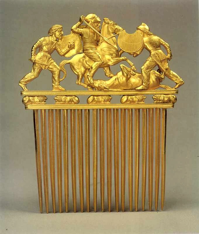 Наступний у нашому списку скарб — унікальний золотий гребінь з воїнами із кургану Солоха, що за 10 км від сучасного Енергодара. Археологи знайшли там також тарілку-фіалу та меч у золотій оправі.