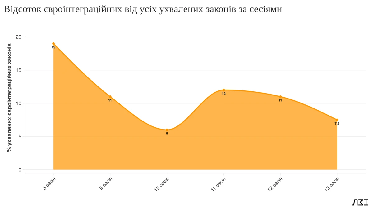 Наприклад, в 2022–2023 роках Парламент ухвалював десятки євроінтеграційних законів (26 за восьму сесію, 22 за 9-ту). Але кожною наступною сесією їх ставало все менше: лише чотири за 10-ту, 16 за 11-ту, 12 за 12-ту, дев'ять за 13-ту, і лише один — за першу половину 14-ої сесії. Водночас середній час розгляду таких законопроєктів поступово зростає. Це може бути ознакою втоми (про що також говорять народні депутати), втрати консенсусу та постійного зростаючого рівня складності рішень.