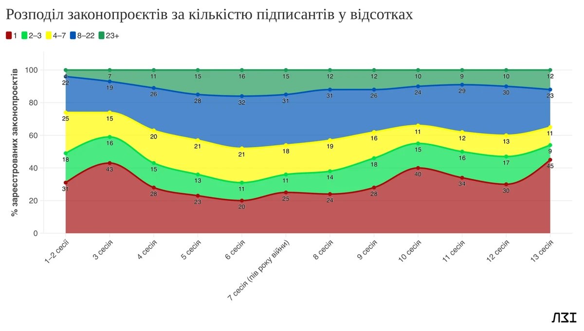 Ситуація зараз, на перший погляд, є неоднозначною. Велику кількість зареєстрованих законопроєктів можна частково пояснити їх перереєстрацією через зміну Уряду. Однак, якщо розглядати депутатські ініціативи, то ситуація дещо інша. Ключовим індикатором спаму є рекордна частка проєктів законів з лише одним підписантом — 45% від усіх зареєстрованих депутатами. Це найвищий показник за усі сесії дев'ятого скликання. Фактично майже кожен другий документ подавали без підтримки колег, що свідчить про майже нульовий шанс на підтримку в залі.