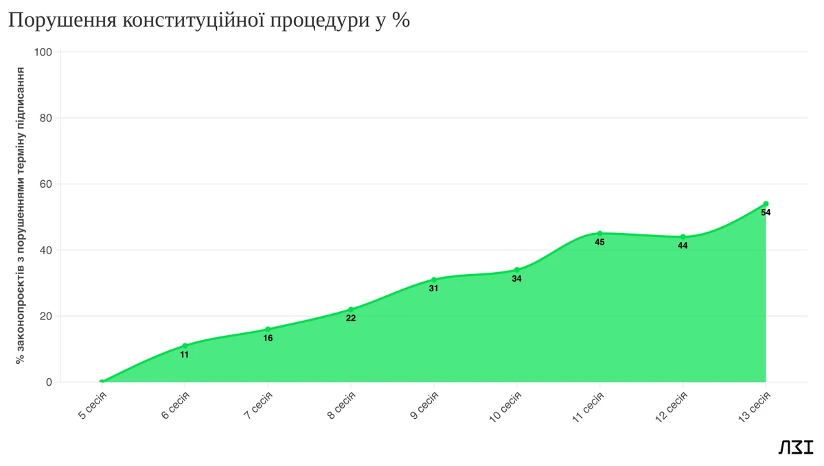 За результатами тринадцятої сесії, щонайменше кожен другий ухвалений протягом 13 сесії закон або підписано з порушенням конституційних строків, або взагалі досі не підписано (54%). Це найвищий показник за усе дев'яте скликання, можливо, і за весь час. Так, наприклад, закон № 3291-ІХ щодо заходів, спрямованих на погашення заборгованості на оптовому ринку електричної енергії, Парламент ухвалив у липні 2023-го, Президент же підписав його лише в січні 2025 — після 518 днів очікування.