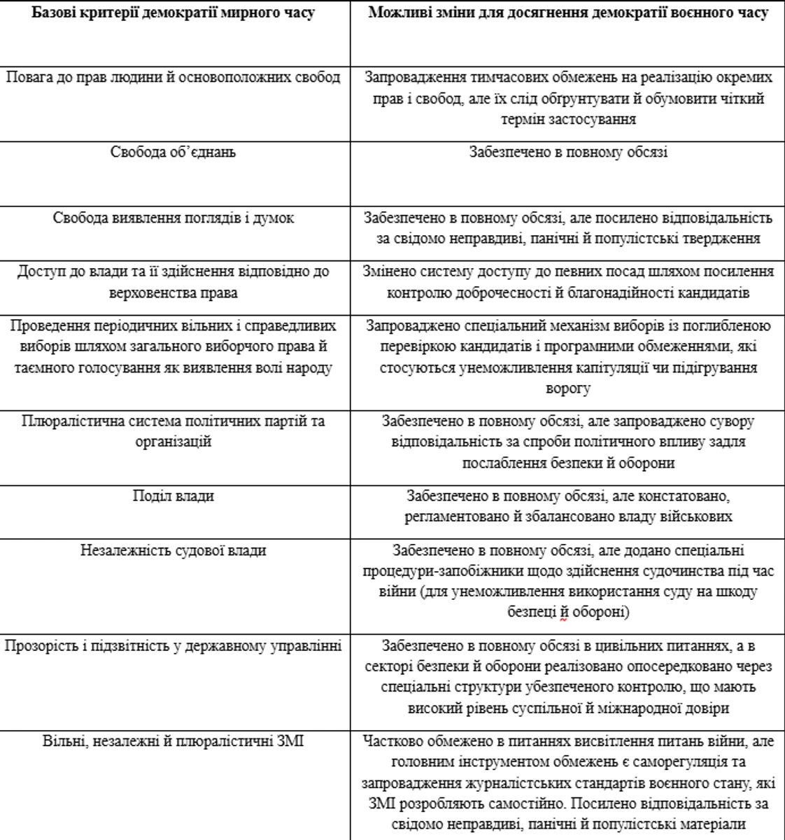 Щоб розуміти нюанси означеного вище перетворення, варто розглянути всі компоненти демократії мирного часу й поміркувати, як вони можуть змінитися, але не зникнути в час війни (адже їх утрата означатиме сповзання країни в авторитаризм чи військову диктатуру). Тож розглянемо класичні критерії демократичного режиму, сформульовані ООН (Global Issues Democracy), і спробуємо позначити їх модифікації та процедурні обмеження для досягнення більшої ефективності в час війни: