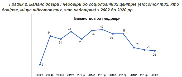 Дослівно: "Рівень довіри до даних соціологічних опитувань за останні роки практично не змінився (в 2019 був 42%, а в 2020-му – 41%). Баланс довіри і недовіри (відсоток тих, хто довіряє, мінус відсоток тих, хто недовіряє) складає +20%, рік тому він дорівнював +21%".