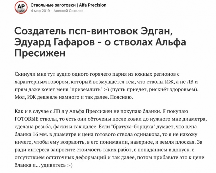 The first paragraph reads: "I received the audio of one hot guy from the southern regions with a characteristic dialect, who is outraged that the barrels (are made by) IZH, and not LV, and he even wants to 'bring me down to land'. Like, IZH is much cheaper and so on. I will explain."