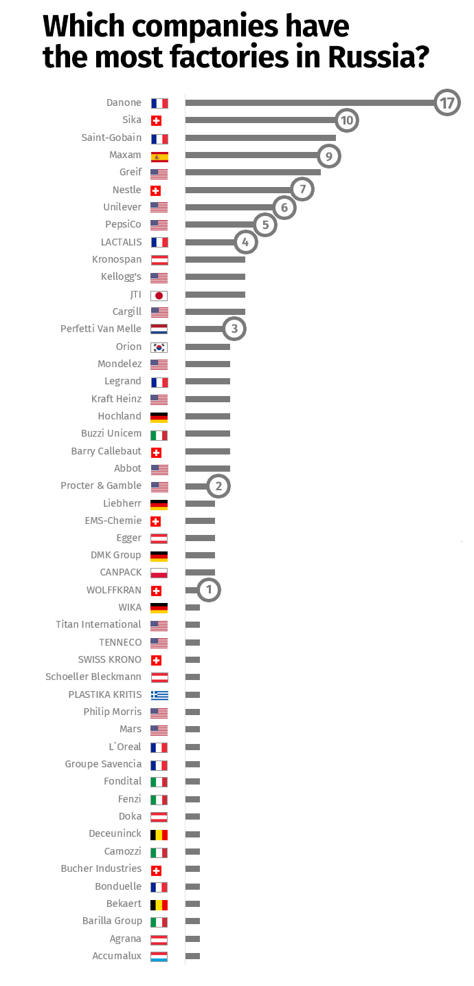 Over 1000 companies are still operating in Russia at full or limited scale and, therefore, are responsible for funding Kremlin’s war machine. However, some companies bear more responsibility for this than others. Those are the ones that have invested millions and billions of dollars in building plants and factories in Russia providing jobs for thousands of people and generating millions and billions of local revenues. Among them is Danone with its 16 plants and a farm, Nestle with its seven plants, Lactalis with its four plants… Altogether at least 50 international companies with 154 production sites in various regions of Russia are still operating at a full or limited scale (see the full list with the plants’ addresses here). Such companies are highly reluctant to leave the aggressor country, but their exit would have the most significant impact on the Russian economy.
