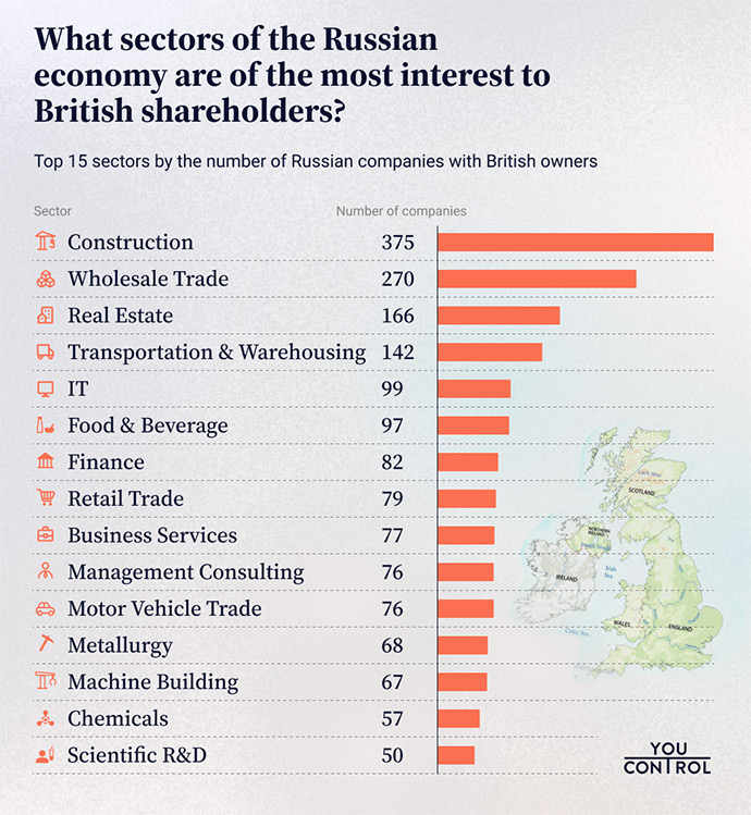 - The largest share of British capital in Russia is represented in construction, wholesale trade, real estate operations, transport, logistics, and IT.
