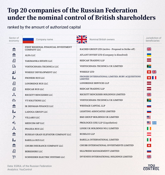 A detailed analysis of the largest Russian companies with British capital has shown that a substantial part of the nominal British owners is under the control of the ultimate beneficiaries of Russian or non-British origin.