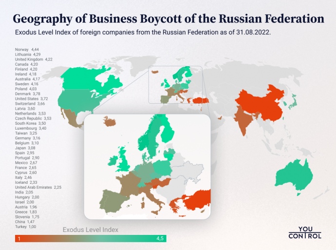 The withdrawal of companies from the Russian market or closing up operations there is called a business boycott, which is voluntary or indirect sanctions. To quantify the level of business withdrawal from Russia, YouControl has developed a unique integral index ELI (Exodus Level Index). It aggregates information on the distribution of the number of companies from a particular country across five categories of corporate reaction to the Russian-Ukrainian war. Recommendations of Yale University researchers on the classification of foreign companies were taken into account when forming the index. In a preliminary study, the YouControl R&D Center has already assessed the withdrawal rate of foreign companies from Russia by country and economic sector. According to Yale University, the number of researched and identified British companies involved in business cooperation with the Russian Federation reaches 96. The average index of business boycotting of Russia by British companies ELI = 4.3. And this is quite a high level on a scale from 1 to 5.