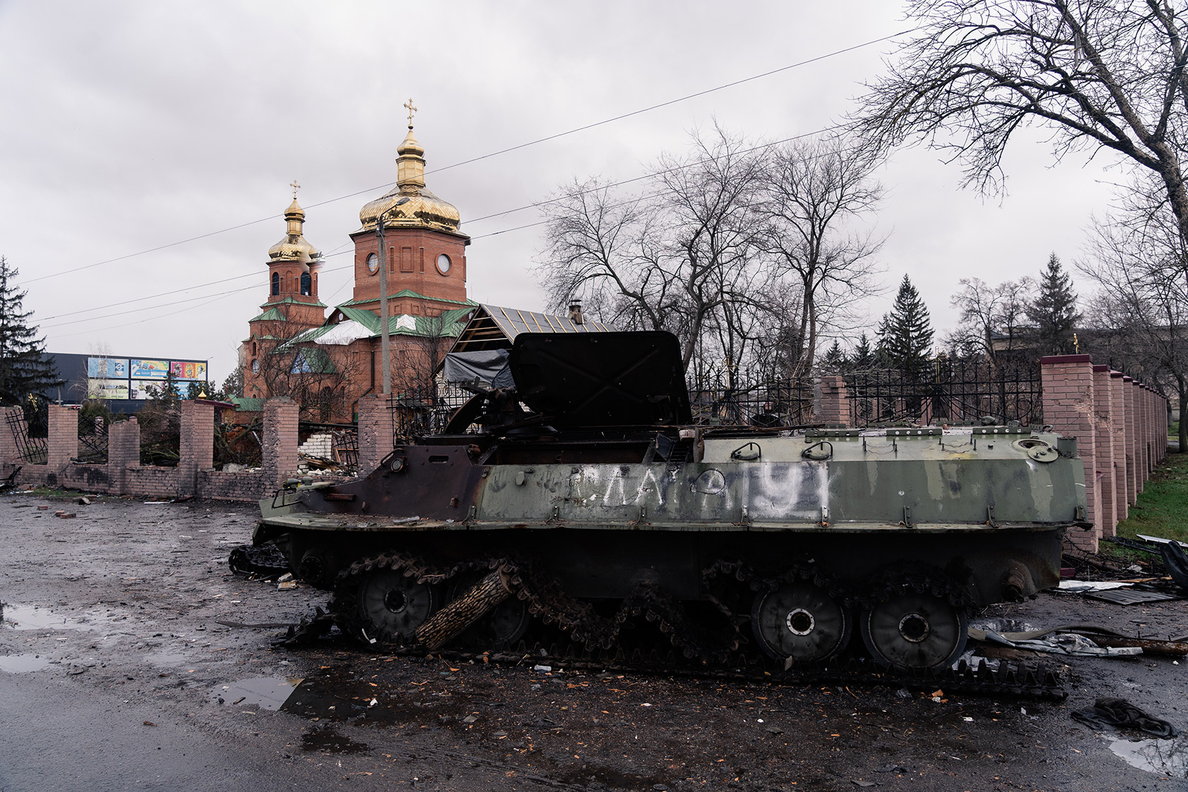 We pass a community arts centre with broken windows and some blue-and-yellow graffiti saying "Vovchansk". Outside a church, its domes pierced and the fence smashed in, we see a dilapidated armoured fighting vehicle and a vandalised police van.