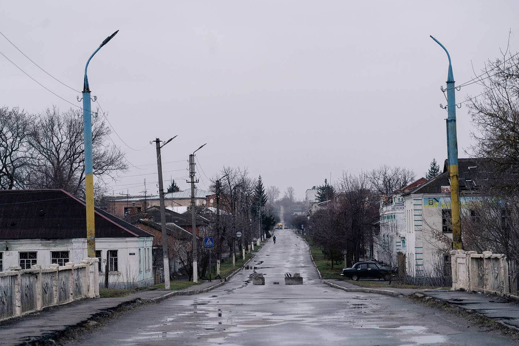 We leave the civil defence centre and head to the other side of Vovchansk along Soborna Street, which used to be named after Lenin before decommunisation. The snowstorm is over, but there are no more people out and about than there were before.
