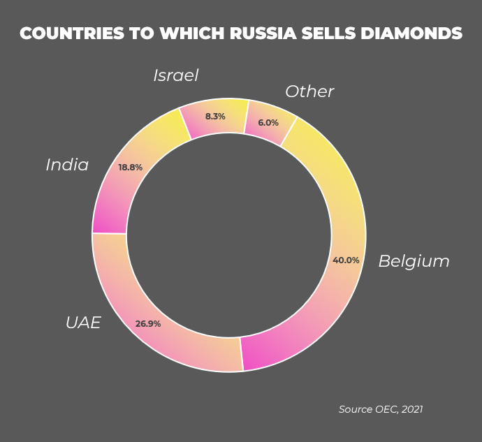 UN Comtrade estimates that Russia supplied nearly US$1.5 billion worth of diamonds to the Western market in 2022. 95% of this volume ended up with buyers from Belgium, as Antwerp is home to the world's largest diamond hub. The famous diamond district of this city sees gemstones from all over the world.