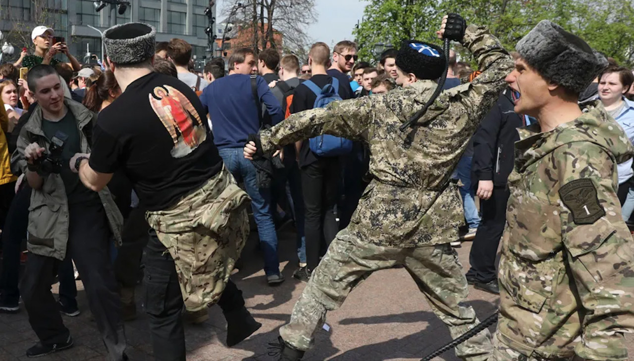 Besides the protesters, a few dozen Russian Cossacks in camouflage showed up at the statue of Alexander Pushkin in Moscow.