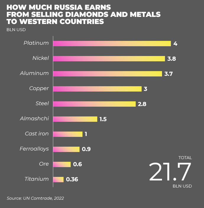 Russia earned US$20 billion from exports of metals and diamonds to Western countries in 2022 alone - and the aggressor continues to generate revenue because these goods have not been banned.