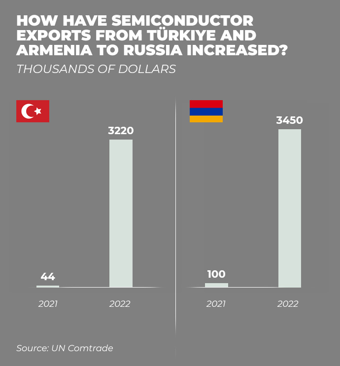 Semiconductor exports to Russia from Türkiye, Armenia, Kyrgyzstan, Kazakhstan and Serbia have increased tenfold. None of these countries are manufacturers of microchips. They play the role of intermediaries.